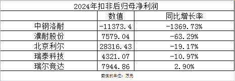 不過(guò),對于瑞爾競達業(yè)績(jì)持續增長(cháng)的真實(shí)性,筆者卻產(chǎn)生了深深的懷疑。據悉,瑞爾競達在申報稿中披露,其同行可比公司分別為中鋼洛耐、濮耐股份、北京利爾、瑞泰科技,而Choice金融終端顯示,上述公司2024年扣非后歸母凈利潤的具體情況如下: