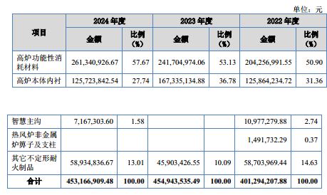 從產(chǎn)品上看,瑞爾競達主要擁有高爐功能性消耗材料、高爐本體內襯智慧主溝、熱風(fēng)爐非金屬爐箅子及支柱、其它不定形耐火制品,其中高爐功能性消耗材料產(chǎn)生的銷(xiāo)售收入分別為2.04億元、2.42億元、2.61億元,分別占當期主營(yíng)業(yè)務(wù)收入的50.9%、53.13%、57.67%,為公司最重要的產(chǎn)品,具體情況如下: