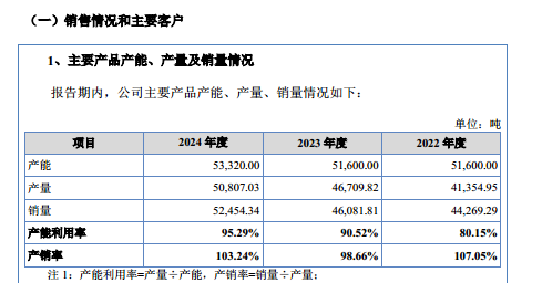 另外,瑞爾競達申報稿中的另一組數據,進(jìn)一步加深了外界對其業(yè)績(jì)增長(cháng)合理性的懷疑。招股說(shuō)明書(shū)顯示,報告期內,瑞爾競達的產(chǎn)能分別為51600噸、51600噸、53320噸,產(chǎn)量分別為41354.95噸、46709.82噸、50707.03噸,也就是說(shuō),2024年,瑞爾競達不僅提升了產(chǎn)能,產(chǎn)量更是較上一年同比增長(cháng)了8.77%。