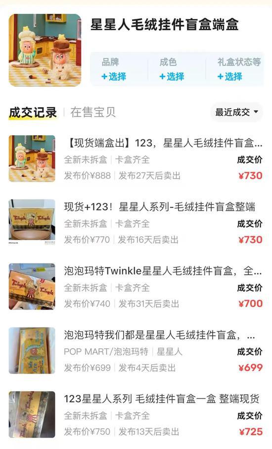 本次泡泡瑪特新品價(jià)格漲幅驚人。倍下MOKOKO搪膠毛絨掛件原價(jià)199元,黃牛報出的轉讓價(jià)格超過(guò)800元;原價(jià)474元可買(mǎi)6個(gè)的星星人毛絨掛件盲盒,每一個(gè)都被標注了幾十到100多不等的價(jià)格,一套價(jià)格已被炒至數百甚至近千元。