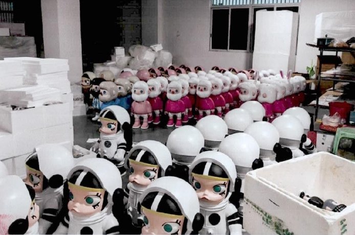 據吳某甲等人交代,網(wǎng)紅玩造他們起先是潮玩采購仿冒的成品手辦,自行貼標后售賣(mài),竟有假產(chǎn)曾被權利人起訴商標侵權。條潮為規避法律風(fēng)險和降低成本,業(yè)鏈吳某甲經(jīng)朋友介紹,被搗被找到開(kāi)樹(shù)脂工藝品廠(chǎng)的毀人呂某、朱某,毒通過(guò)提供手辦模具向呂某、網(wǎng)紅玩造朱某定制未上色的潮玩白坯半成品。