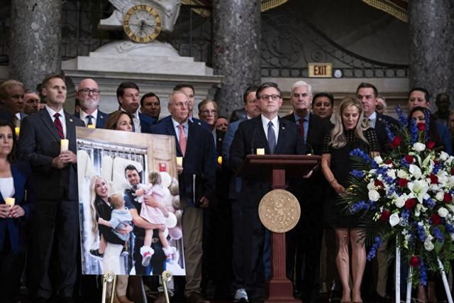 當地時(shí)間2025年9月15日,柯克美國華盛頓,名左翼追責眾議院議長(cháng)邁克·約翰遜(中)在美國國會(huì )雕塑廳為政治媒體人查理·柯克舉行全體成員追悼會(huì )。特朗統性視覺(jué)中國 圖