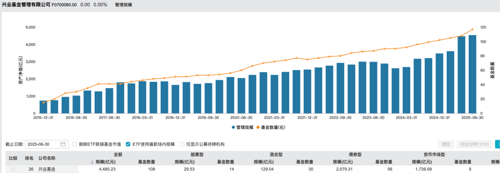 Wind統計顯示,截至2025年二季度末,興業(yè)基金公募基金資產(chǎn)凈值合計4480.23億元,已攀升至公司歷史最高規模,行業(yè)內排名第26位。其中,非貨幣型基金規模為2740.64億元,債券型基金規模高達2579.31億元,占非貨規模的94.11%;股票型基金、混合型基金規模則分別為29.53億元、129.04億元。